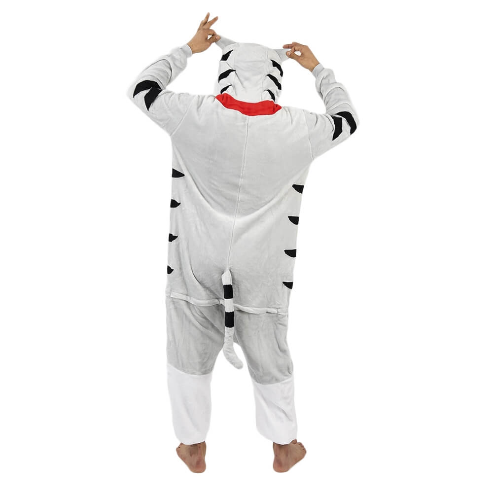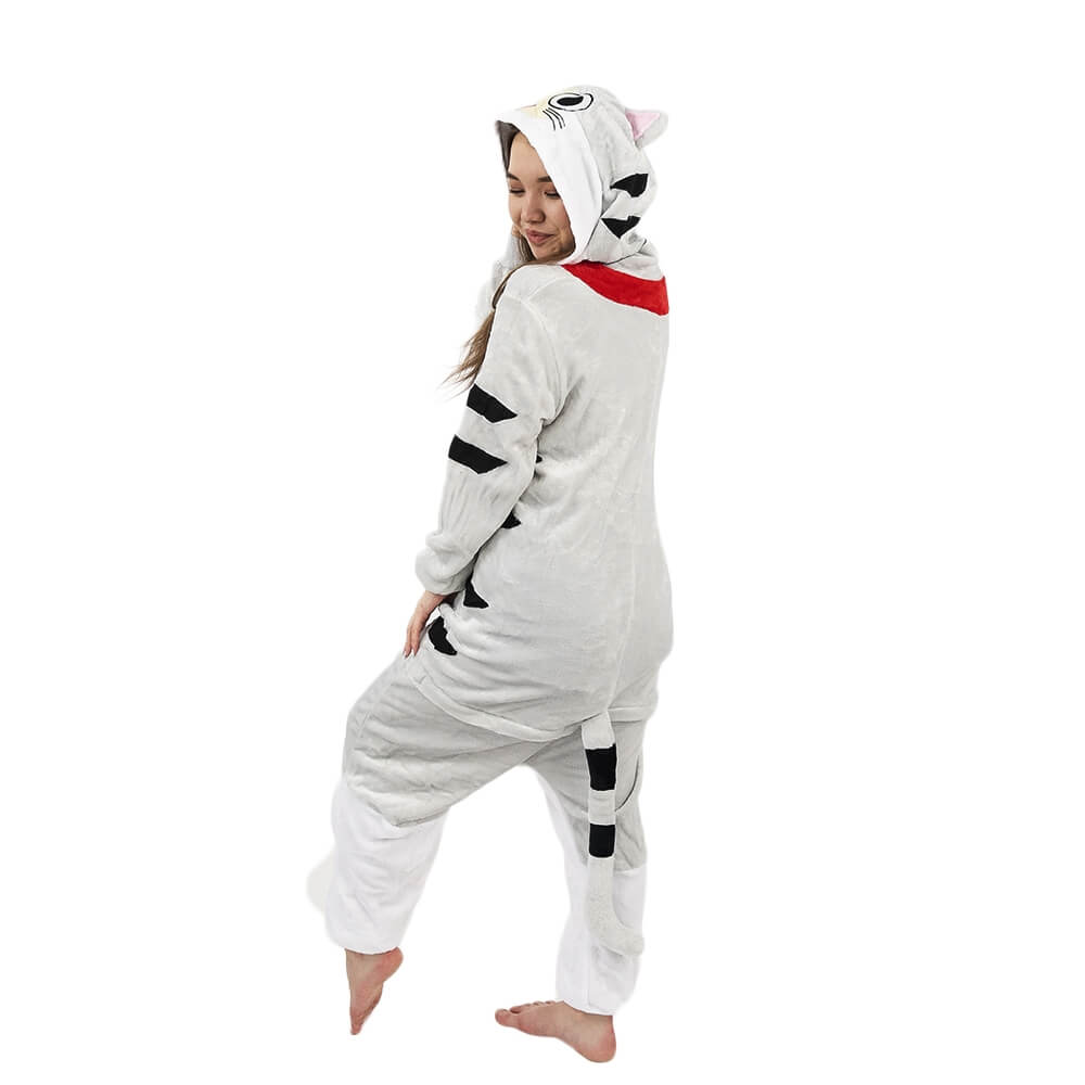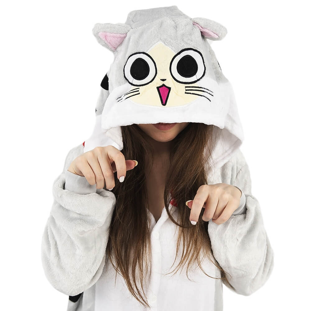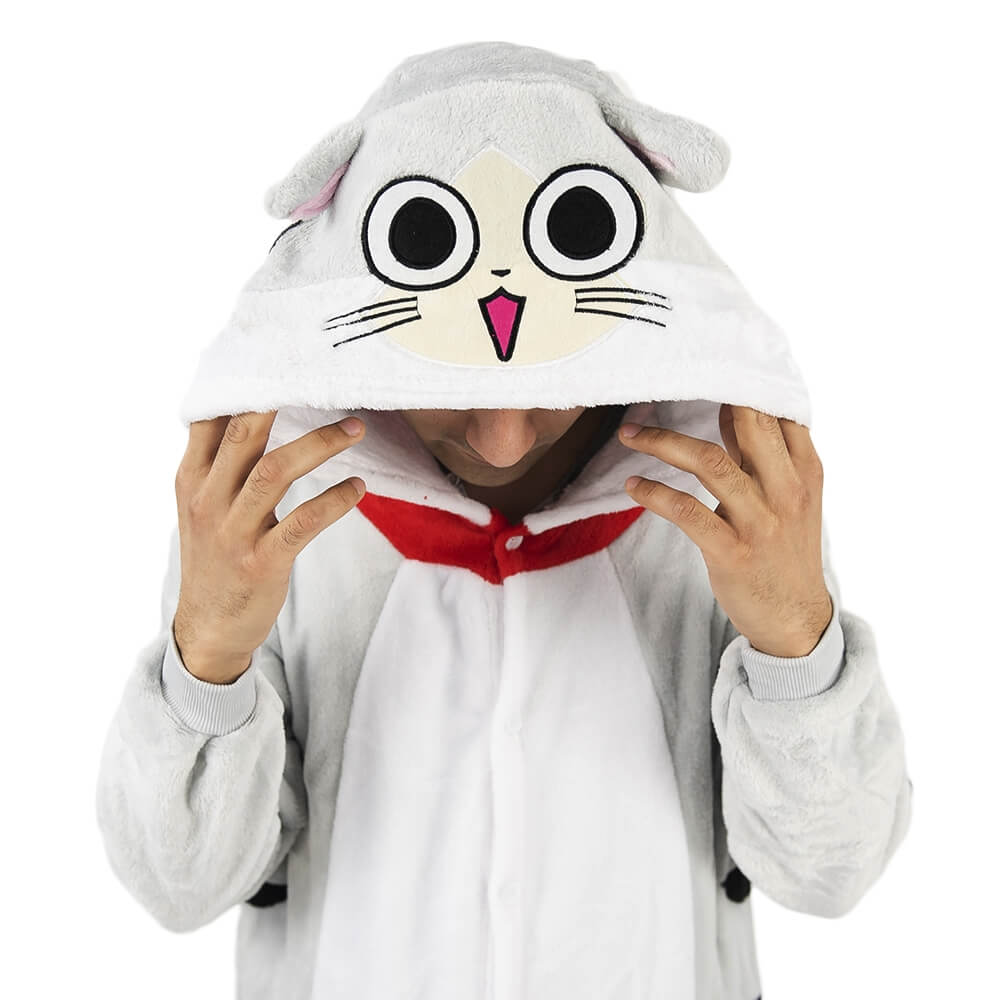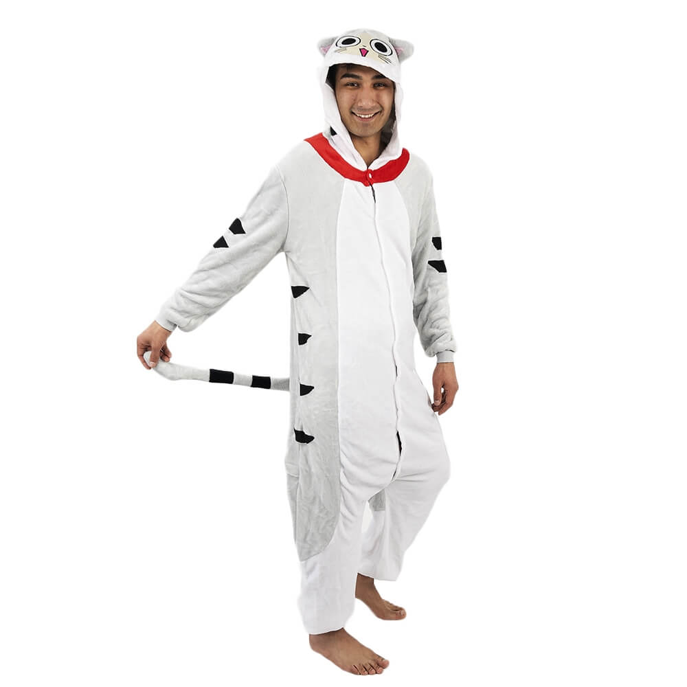 Котенок Чи – персонаж из мультфильма аниме. Кигуруми выполнен по мотивам этого мультфильма, а дизайн придает схожесть с персонажем. Бело-серая расцветка смотрится свежо и нарядно. Черные полосочки на хвосте, по бокам и на капюшоне придают игривости образу. Мордочка выполнена в технике аппликации с элементами вышивки.