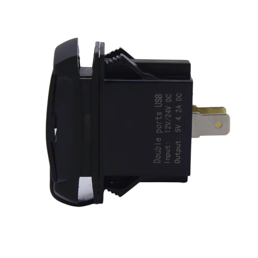 Встраиваемый в панель преобразователь на два порта USB. Устройство подключается к бортовой сети автомобиля 12 В или 24 В. Ток каждого порта составляет 2,1А. Преобразователь устанавливается в прямоугольное монтажное отверстие и фиксируется специальными защелками. На заднюю стенку устройства выведены две плоские клеммы для подключения входного напряжения.